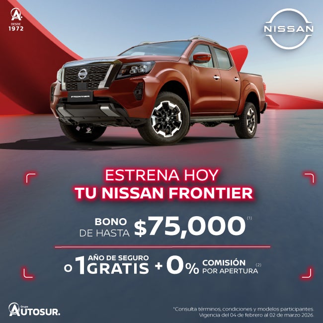 Se aplica para FRONTIER SE TM '26 en operaciones de crédito celebradas con Credi Nissan (No aplica a otras promociones). (2) Aplica para todas las versiones Frontier 2026 en operaciones de crédito celebradas con Credi Nissan. No aplica con otras promociones ni en compra de flotillas. Para conocer planes y modalidades de crédito, verificar precios, requisitos de contratación, comisiones, disponibilidad, términos y condiciones, consulta a tu Distribuidor Autorizado Nissan. Vigencia del 04 de febrero al 03 de marzo 2026.
